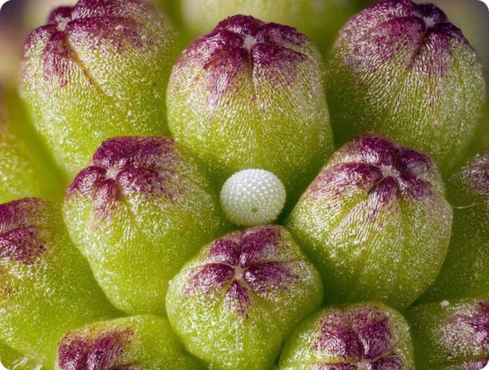 Яйцо бабочки на бутоне цветка (увеличение х6). Фото сделано в Остине, штат Техас.