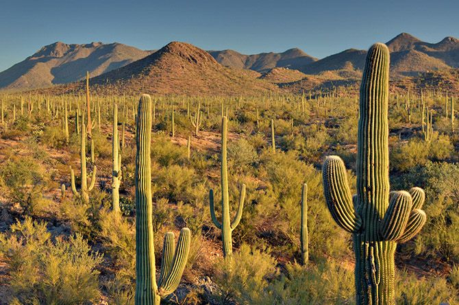 Более 50 видов кактусов можно увидеть в весьма необычном парке США — Сагуаро. Объект расположен в юго-западном штате Аризона. Название парк получил благодаря своей главной достопримечательности — гигантскому кактусу сагуаро или карнегия, размер которого достигает до 15 метров.