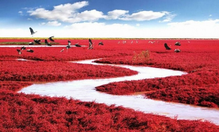 Берега китайской реки в провинции Ляонин становятся красными из-за соединения отмирающих водорослей с соленой водой. Каждый год тысячи туристов приезжают полюбоваться на это редкое зрелище.