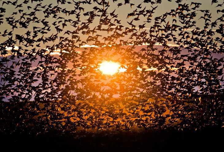 Когда скворцы собираются в стаю, они становятся похожи на жидкую среду, которая кружится и стремительно меняет форму, создавая в небе причудливые фигуры и двигаясь как один живой организм.