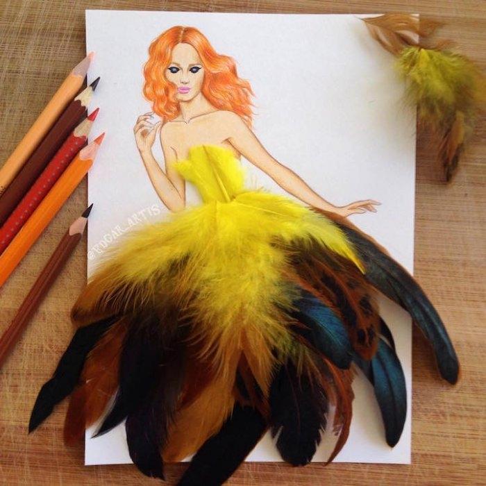 Все согласятся с тем, что спагетти – это вкусно. Но вряд ли в реальной жизни нам повезет столкнуться с девушкой в платье, созданном из спагетти или кетчупа с картошкой фри. Благодаря авторскому проекту этого иллюстратора из Армении, у нас появился такой шанс. Рисунок, созданный цветными карандашами, дополняется физическими объектами, среди которых может быть не только еда, но и стружка от карандаша или птичьи перья, сгоревшие спички и много чего еще. Фантазии автору явно не занимать.