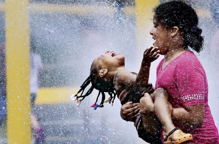 6. Девятилетняя Джашанте Холланд веселится с трехлетней Элайей Стэнли на водном аттракционе в Дэнвилле, штат Вирлджиния. (AP Photo/Register & Bee, Steven Mantilla)