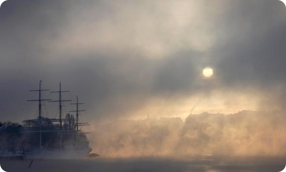 Солнце пробивается через туман над бухтой в скованном морозом Стокгольме. Днем температура в Стокгольме держится на отметке -14, и метеорологические службы предсказывают дальнейшее похолодание. (REUTERS/Bob Strong)