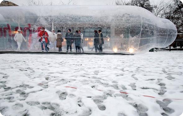 Обычные люди и статисты в костюмах сперматозоидов стоят в инсталляции в виде огромного презерватива на заснеженной Площади Героев в Будапеште 1 декабря, во Всемирный день борьбы со СПИДом. (BERNADETT SZABO / Reuters)
