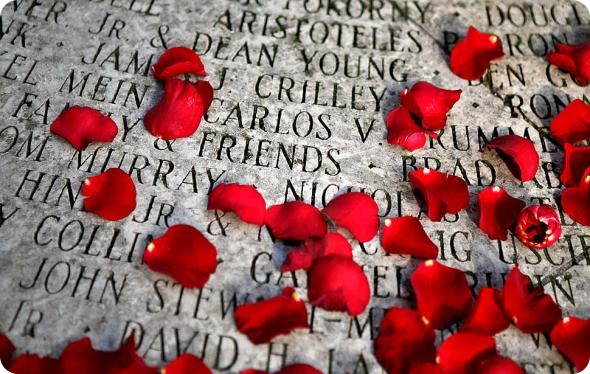 Лепестки роз на именах жертв СПИДа, выгравированных на мемориальной плите в Сан-Франциско.