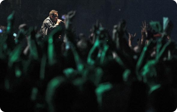 Вокалист группы U2 Боно выступает на первом концерте их мирового турне на стадионе «Этихад» в Мельбурне.