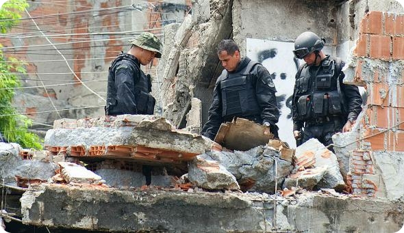 Бразильский полицейский осматривает место взрыва бункера наркобарона в трущобах Вила Крузейро в Рио-де-Жанейро. На прошлой неделе полиция и армия начали операцию по зачистке трущоб от наркоторговцев. Район Вила Крузейро стал одним из самых опасных и преступных в Рио. Эта операция стала главным шагом к организации безопасности в Рио в преддверии Чемпионата мира по футболу в 2014 году и Олимпийских игр в 2016.