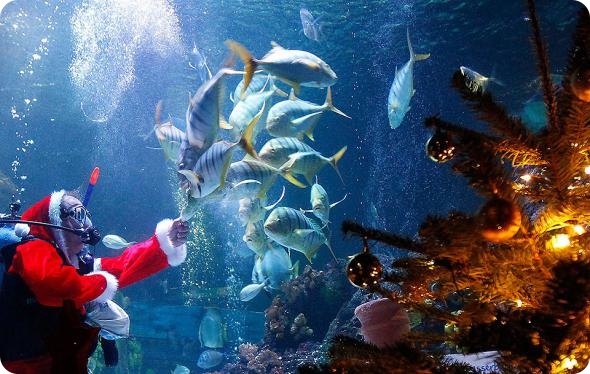 Дайвер Торстен Хеппнер в костюме Санта Клауса кормит рыб в аквариуме SeaLife немецкого города Тиммендорф. (CHRISTIAN CHARISIUS / Reuters)