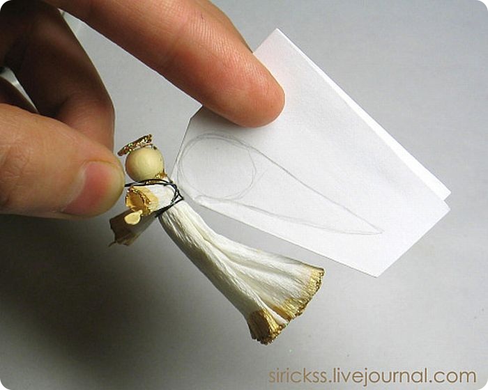 Крылья прошить ниткой, обвязывающей ангела, через проволочную петельку, при этом надо сделать несколько узелков и закрепить их клеем. Затем отрезать один из концов нитки. Для уверенности перед пришиванием крыльев можно капнуть клея на место соединения.