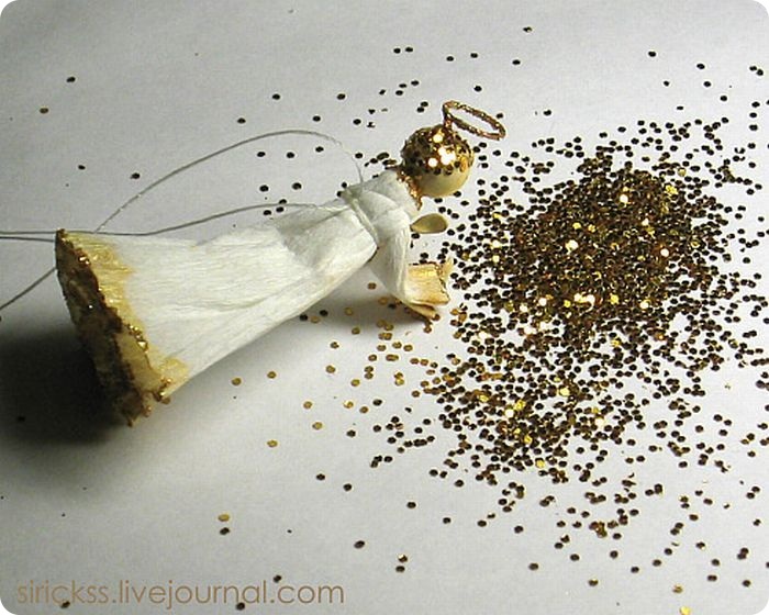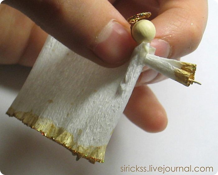 Для одеяния нужна полоска креповой бумаги около 15-17см в длину и 3-3,5см в ширину. Один край её окрашен золотым акрилом при помощи кисти. Когда он высох, аккуратно наношу по торцу бумаги клей ПВА и обмакиваю в мельчайшие золотые блёстки. От готовой бумажной полоски отрезаю примерно 1,5-2см для каждого рукава и около 9-12см для платья. Этими же блёстками покрыт нимб.