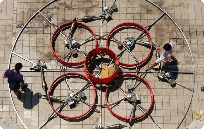 Его летающая тарелка работает на базе восьми двигателей от мотоцикла и винта на вершине.
