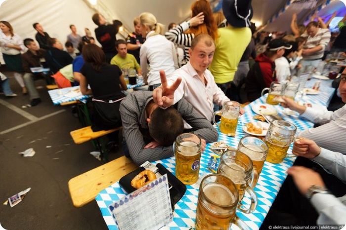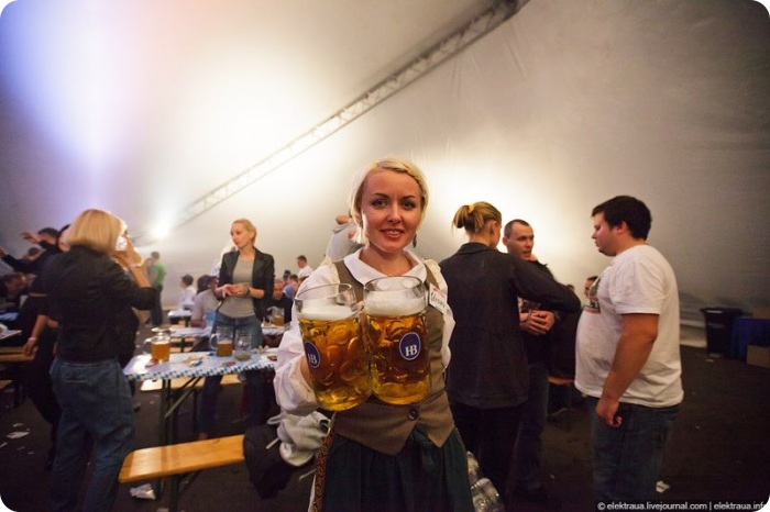 Пока все смотрели на сцену, на три четверьти пустые бокалы заменяли полными. Пиво подавалось исключительно в литровых кружках. Кроме нашего Черниговского, попробовать можно было эксклюзивное пиво из Мюнхена таких марок как Hofbr�u, K�nig Ludwig, Erdinger, Lowenbr�u