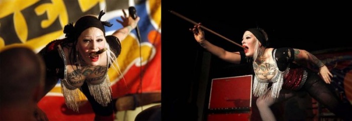 5. Челси Ноупэнтс родом из Нового Орлеана. Она умеет глотать шпаги, ходить по стеклу и является хореографом шоу. «В глотании шпаг, хотите верьте, хотите нет, нет ничего сложного, оно демонстрирует контроль духа над телом» говорит она.