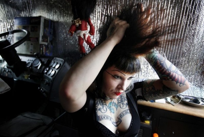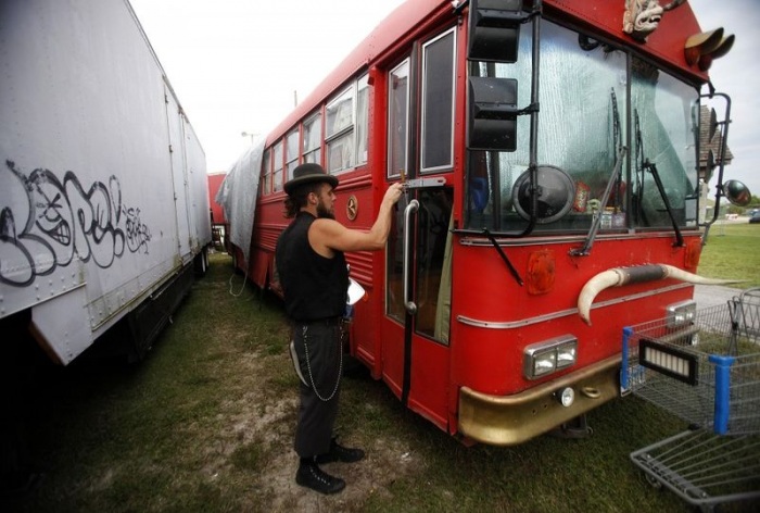 35. Джей Ли Бейт и Марианна Магдален в автобусе, ставшем настоящим домом для цирковой труппы. «Мы привыкли так жить», рассказывают они. «Мы привыкли к тому, чтобы наводить марафет и ходить в туалет в автобусе». Правда, красимся мы обычно все-таки на остановках».
