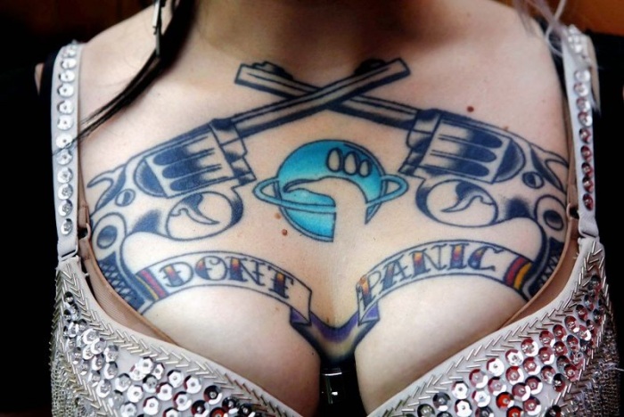 4. Татуировка «не паникуй» из «Путеводителя по галактике» Дугласа Адамса украшает грудь Челси Ноупэнтс. «Я была всегда очень тихой и забитой», рассказывает она. «Я решила с этим что-то делать, выбить из себя эту застенчивость и зажатость. Центр груди – это очень важное место. Я именно поэтому выбрала его для своей татуировки».