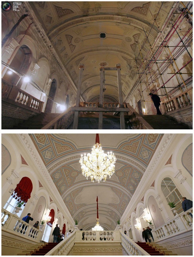 1. Фасад Большого театра во время (2 апреля 2010 года) и после реконструкции, 24 октября 2011 года. Открытие Большого театра прошло 28 октября. Он открывается после шести лет реконструкции, стоившей 700 млн. долларов и постоянно задерживаемой из-за нехватки средств или обвинений в коррупции. (REUTERS/Denis Sinyakov (top) and Anton Golubev)