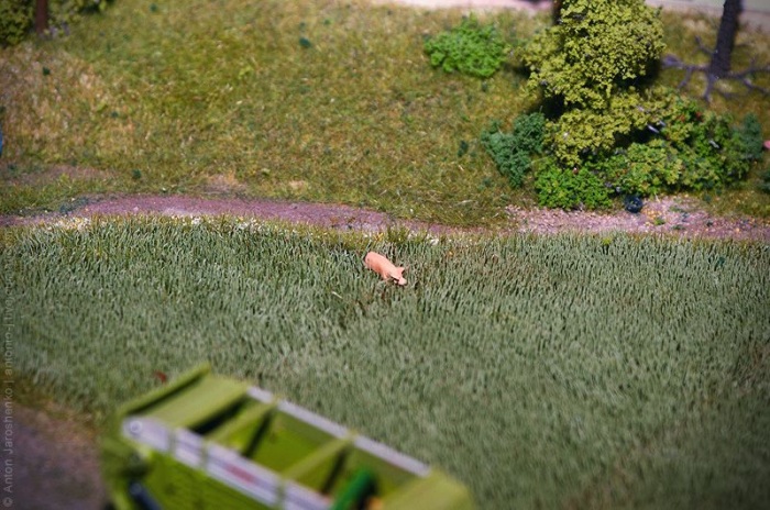 На макете множество различных ситуаций. Вот, например, со свинофермы сбежала свинья.