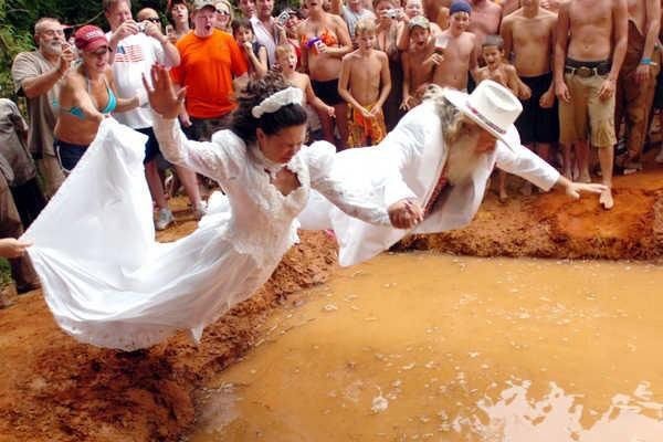 Это самые настоящие соревнования по плюханью в жидкую глину! Болельщики встречают каждое очередное громкое погружение участника в жидкость громкими приветственными воплями, не пугаясь грязного дождя, орошающего их…