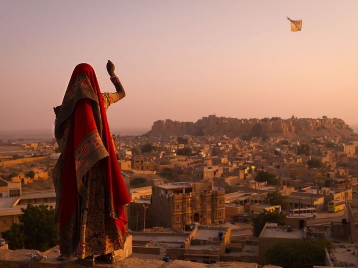 Легкий воздушный змей, сделанный из простой бумаги, лески и сухой ветки, взвился в небо над Джайсалмером, городом посредине Великой индийской пустыни. Живописный город, через который проходят пересекающие пустыню караваны, не стал туристическим центром, поскольку уж слишком далеко от него находится цивилизация со всеми ее благами и радостями. Воздушный змей, запущенный молодой девушкой над городом, выглядит так, словно уносит в поднебесье ее самые заветные мечты и надежды. Быть может, пущенные за ветром, они быстрее исполнятся. Автор фотографии — Саймон Кристен (Simon Christen).