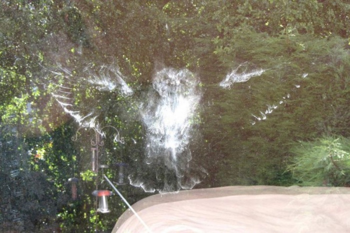 Отпечаток в виде совы на окне дома, 12 июля 2011 года. Хозяева вернулись из отпуска и увидели этот отпечаток на окне своего дома в Кендале на северо-западе Англии.
