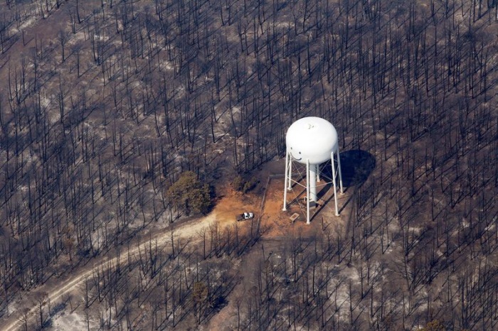 Лес уничтоженный пожаром вокруг водонапорной башни в Bastrop, штат Техас. Огонь уничтожил более 600 домов и около 45 квадратных километров лесов. 7 сентября 2011 года