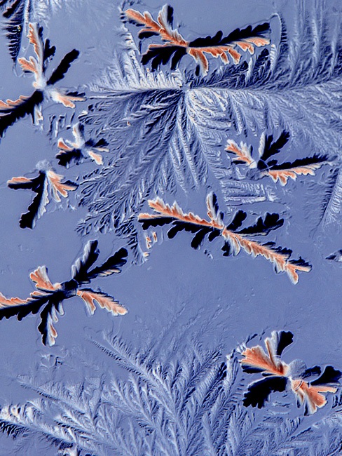 Кристаллы, оставшиеся после испарения жидкости для хранения контактных линз, в 400-кратном увеличении