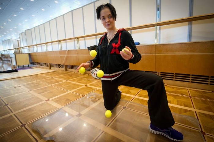 5. Наверху, где в КДС расположен его знаменитый банкетный зал, разминается Мария Чуду — её номер с жонглированием теннисными мячиками, как барабанными палочками, под музыку и чечетку, открывает шоу. Маша — цирковой ребенок, мечатала о цирке Солнца с девяти лет, а в 14 уже стала его артисткой, после того, как отправила видеокассету со своим номером на кастинг и в 2007 году была приглашена в труппу.