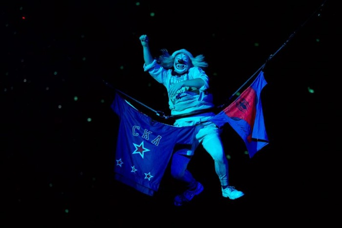 33. В зал стреляют клоуном из пушки и он летает над зрителями, размахивая какими-то майками и показывая девушкам номер своего мобильного на большом плакате.