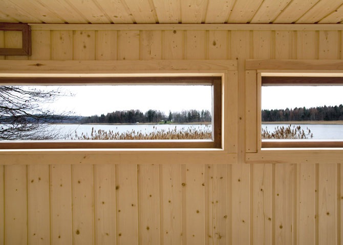 На протяжении 12 лет хозяйка резиденции пыталась получить разрешение на строительство сауны на месте заброшенного лодочного сарая рядом с основным домом. В результате была построена мобильная версия, напоминающая гигантские сани – в зимнее время сауну можно перемещать по замерзшему озеру в поисках проруби.
