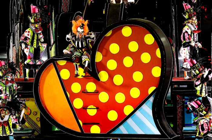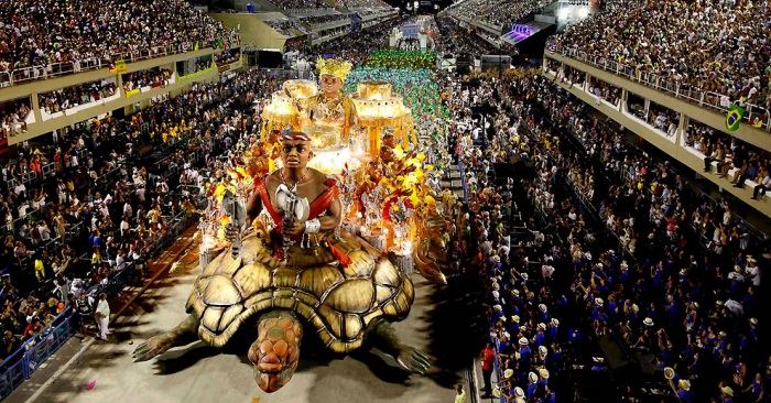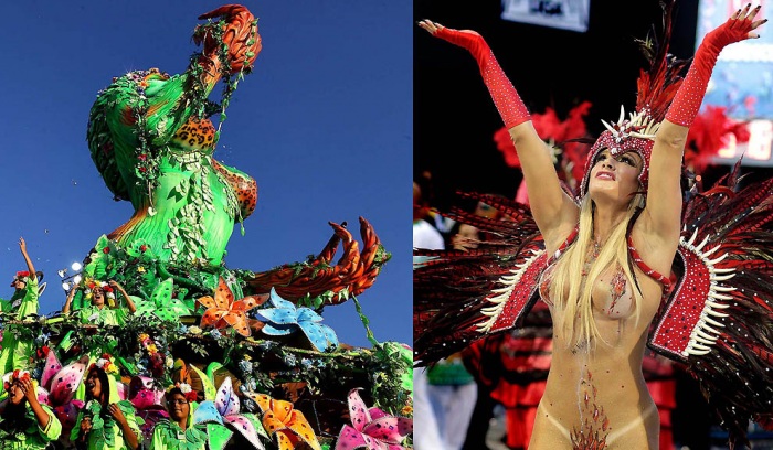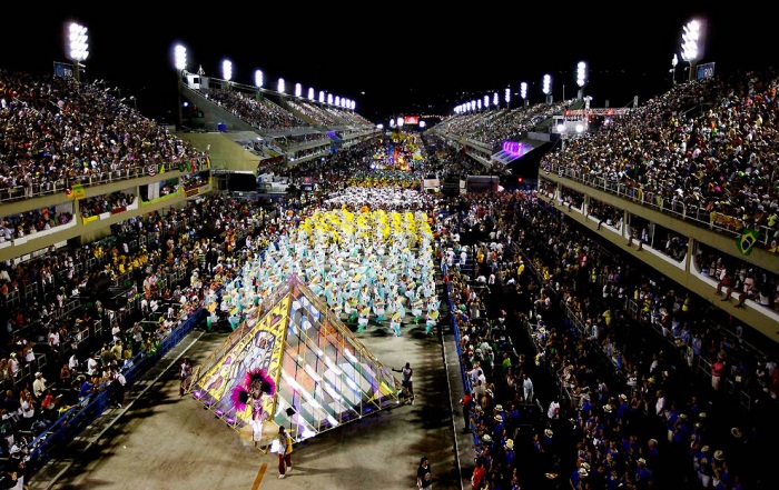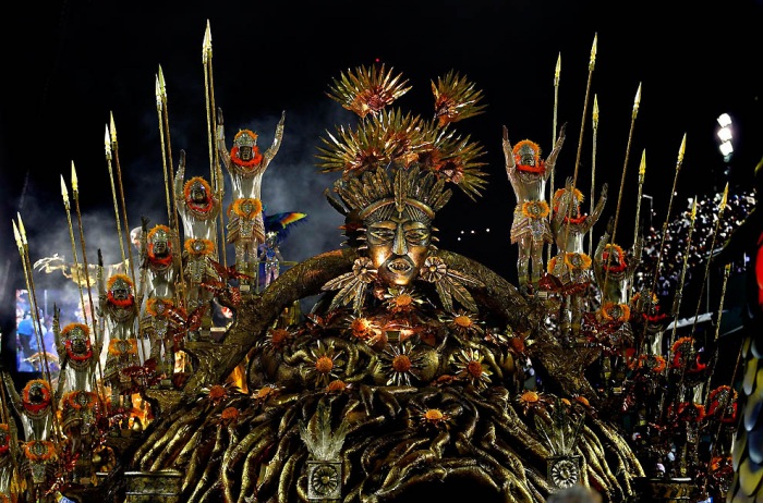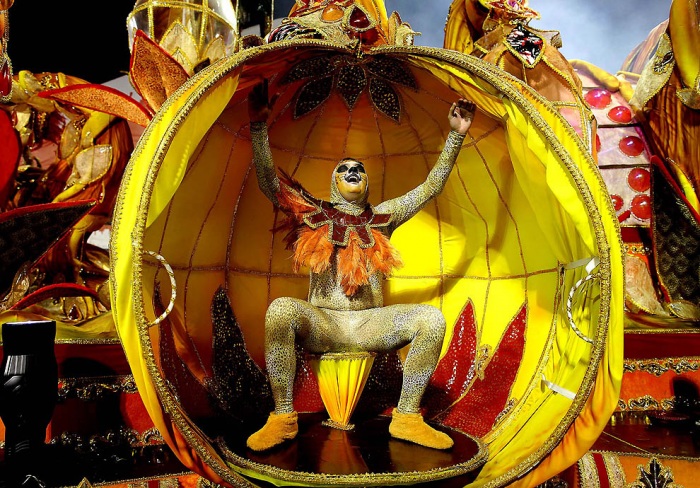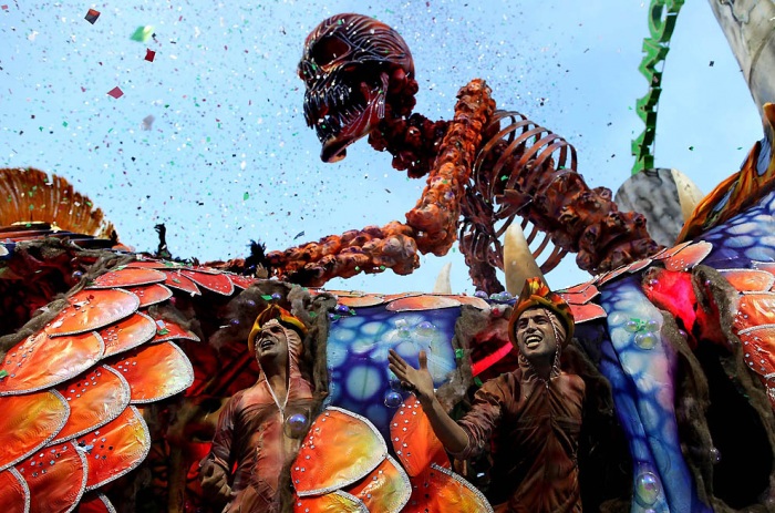 10. Танцоры на движущейся платформе школы самбы «Манча Верде» в Сан-Паулу. (Andre Penner/Associated Press)