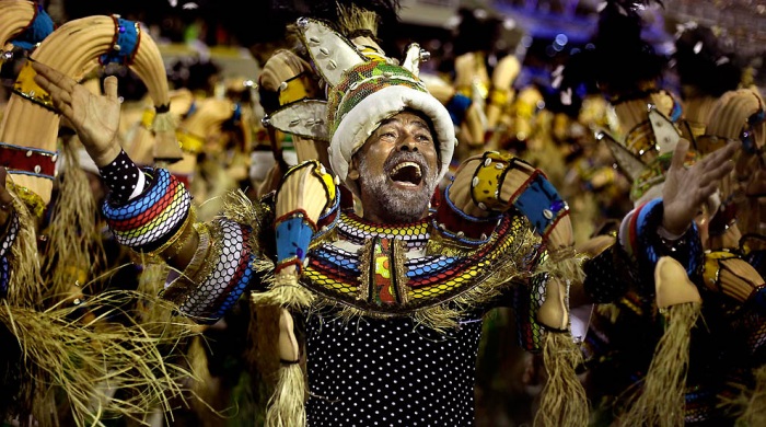 28. Танцоры школы «Гавиоэс да Филь». Темой их выступления было время правления президента Луиса Инасиу Лулы да Силва. (Andre Penner/Associated Press)