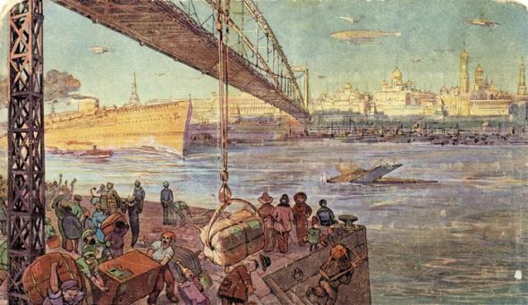 В далеком 1914 году российская шоколадная фирма «Товарищество Эйнемъ» (известная сейчас как фабрика «Красный Октябрь») выпустила шоколадные конфеты под названием «Москва будущего». В каждую коробку с конфетами упаковывалась и серия из 8 рекламных открыток такой же тематики.