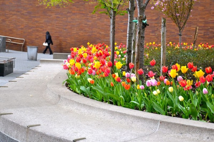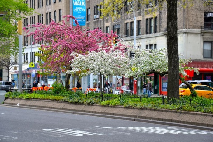 В Нью-Йорке везде лавочки, в каждом вообще возможном месте для этого. Вот, например, оборудована лавочка на пешеходном переходе, защищена от машин, сзади цветочки