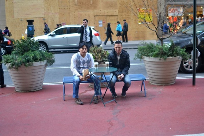 И они везде. Нью-Йоркцы верещали как резанные, когда эти стулья закупали, — мол, украдут всё, это бездарное использование денег налогоплательщиков, кто при нашем климате будет на них сидеть и т.д.