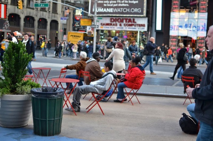 Гейл Архитектс посчитали пешеходов в этом месте, и нашли, что тут их ходит 400,000. Власти Нью-Йорка быстренько устроили «временное» закрытие Бродвея на Таймс-Сквер, расставили там стулья и раскрасили асфальт. 72% жителей Нью-Йорка сообщили потом во время опроса, что это, по их мнению, лучшее улучшение города, которое было за последние 10 лет.