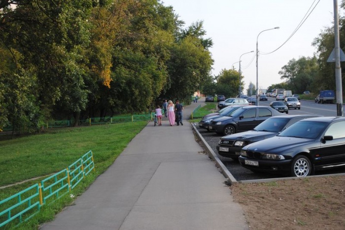 Вот для примера как выглядит тротуар вдоль глухого фасада и без ларьков (Братислава). Вдоль такого, во-первых, неприятно идти, так как вокруг всё монотонно и ничего не меняется, и расстояние кажется намного большим, чем есть на самом деле. Во-вторых, тут менее безопасно, так как вокруг нет людей. И если днём еще ничего, то вечером такие места превращаются в зоны, которые люди стараются обходить стороной или быстренько пробегать.