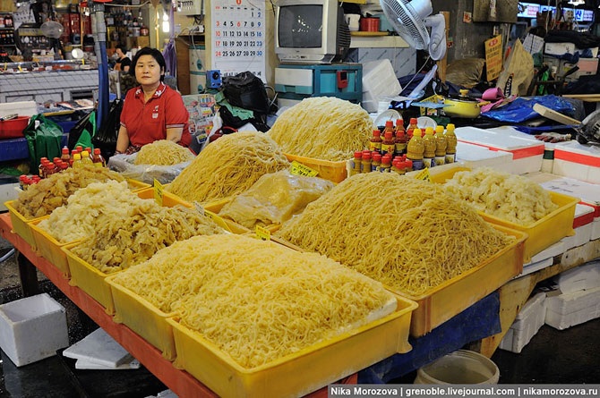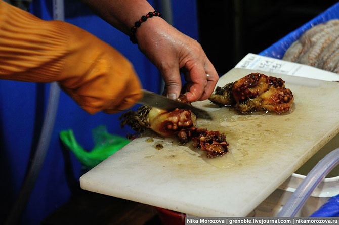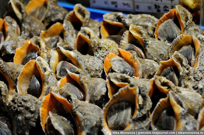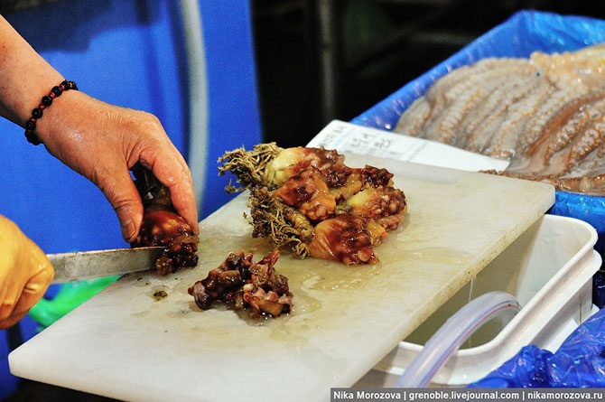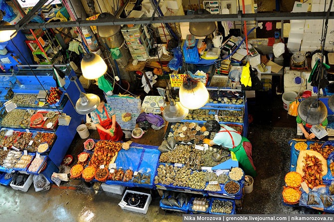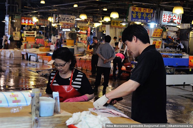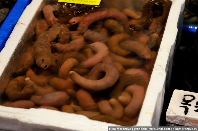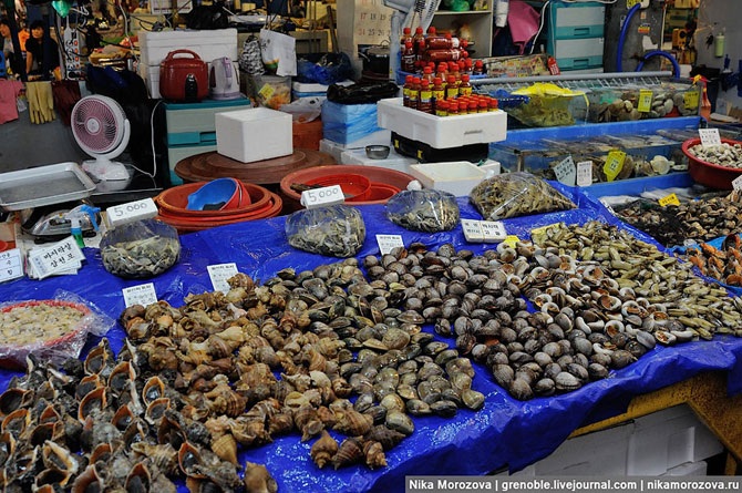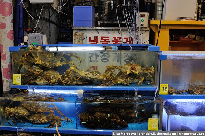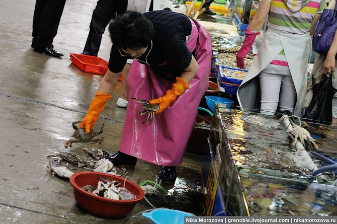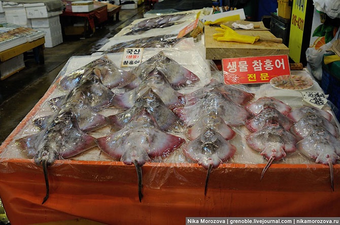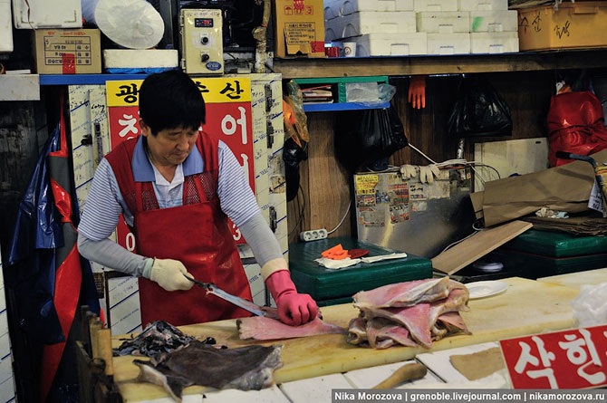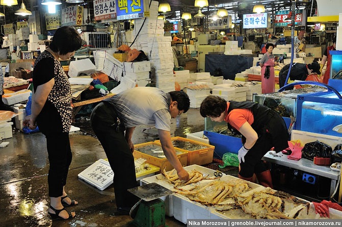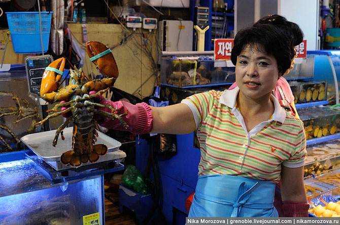 Эта кореянка объяснила нам, что можно выбрать тут на рынке любого морского гада, и тут же в ресторане (по бокам их несколько штук) нам его вкусно приготовят. Конечно же, предлагала нам тут же отведать вот этого красавца. А мы, к сожалению, только-только пообедали, поэтому красавец достался кому-то еще.
