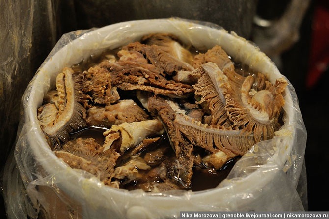Дело в том, что в Корее хорошим тоном считается, чтобы никакая часть съеденного живого организма не пропадала. Именно отсюда появились супы из бычьих хвостов, которые варятся по 3 дня, а также масса соусов из тухлой рыбы и из рыбьих запчастей.