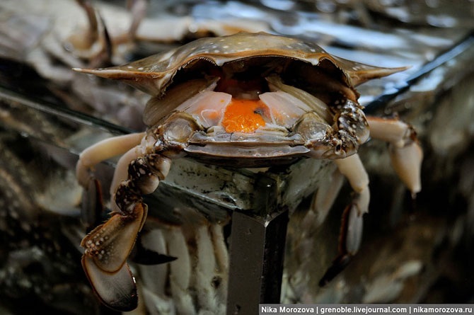 Вот этого вскрыли для демонстрации внутренностей и положили на край аквариума. Кстати, я жалею, что никогда не пробовала такой вид краба.