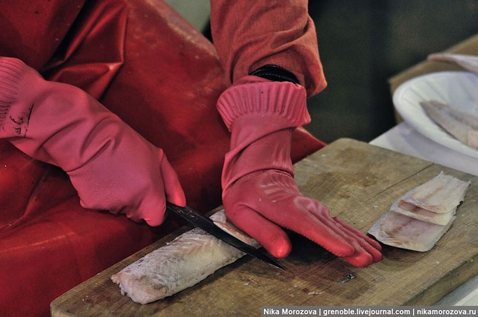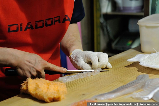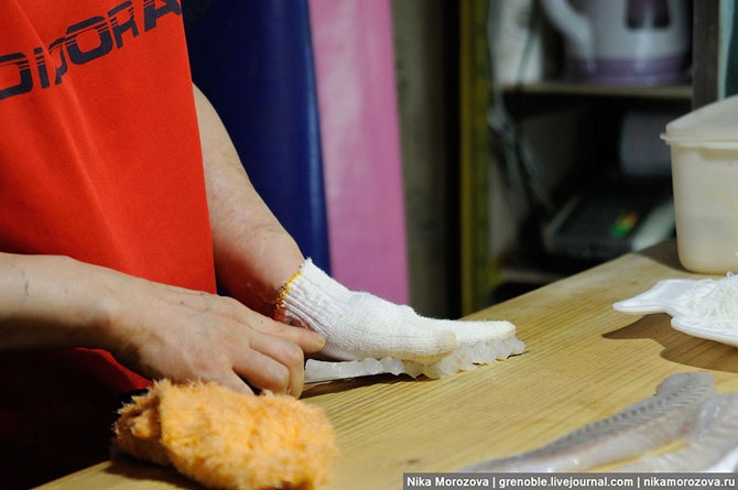 Интересно, но рыбу, которая будет еще подвергаться обработке, они разделывают в резиновых перчатках. А ту, что уже готова к употреблению – в хлопковых. Напомню, что ракушки они в ресторане поедают, тоже надев хлопковую перчатку.