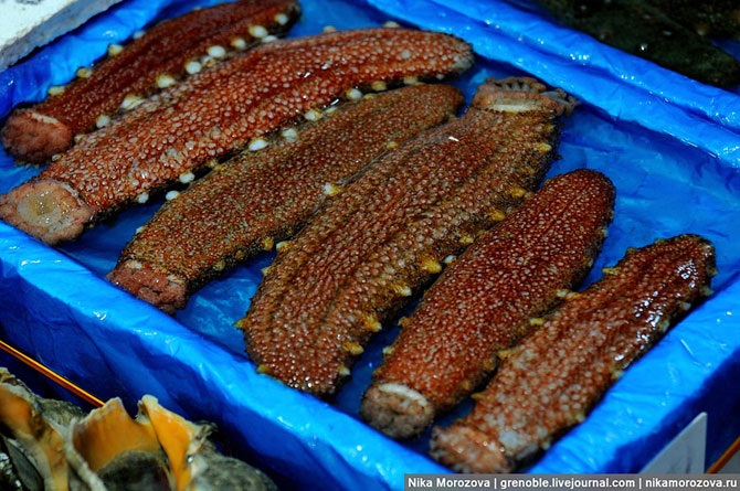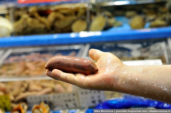 Я не знаю, что это за звери такие, не могу представить, какие они на вкус и с чем их едят, но их несколько видов и встречаются они очень часто. В силу того, что по-английски продавцы практически не изъясняются, комментарий по этой животине получить не удалось. Но знающие люди говорят, что это то, о чем вы подумали: рыба-пенис.