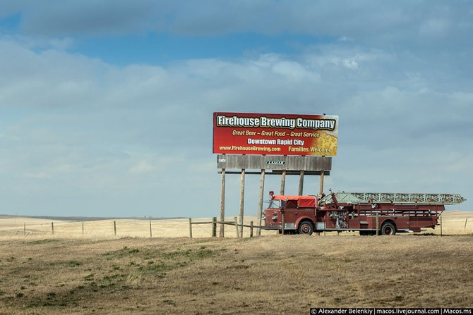 Одна пивоваренная компания где-то закупила десяток старых пожарных машин и поставила их вдоль дороги в штате Южная Дакота. Мне встретилось как раз около десяти их рекламных щитов, и возле каждого стояла такая машина.