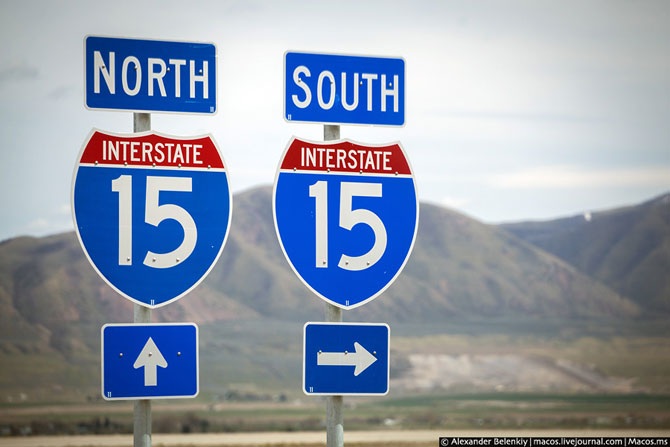 Указатели направления движения на магистралях такие же удобные, как и в городах. Указывают на стороны света. Почти в каждой машине есть встроенный компас. Это указатель для интерстейта.