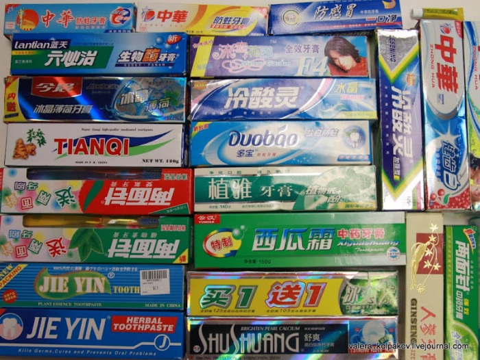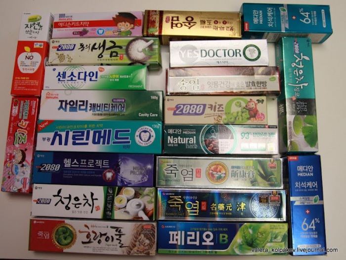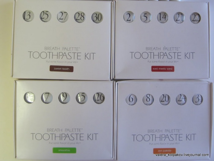 А в этих невзрачных на вид коробочках зубная паста со вкусом йогурта, тыквенного пудинга, карамели, мёда, зеленого чая, розы, грейпфрута, черники, киви, банана, индийского соуса карри, слегка подсолёная… Всего 50 разных необычных привкусов.
