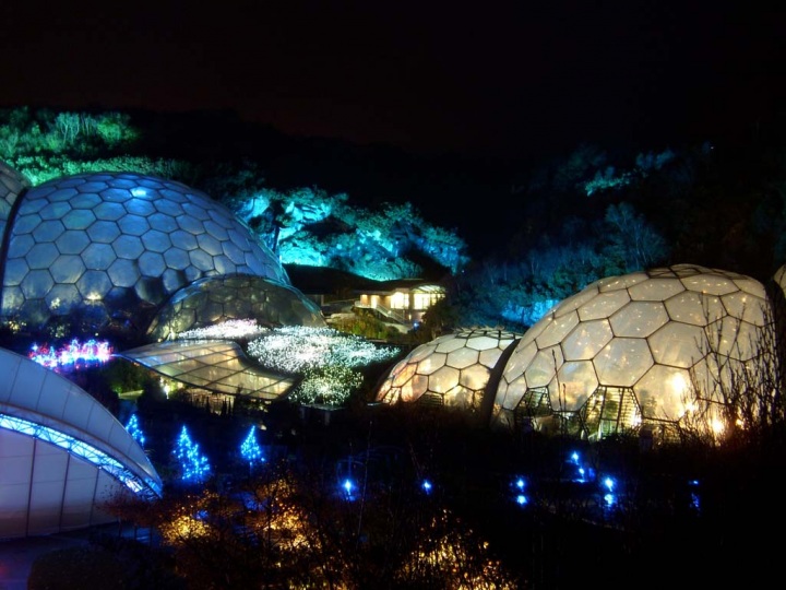 В искусственных куполах находятся растения, собранные со всего света. Проект находится в бывшем карьере по добыче каолинита, в 2 км от городка Сент-Блэйзи и в 5 км от города Сент-Остелл. Комплекс образуют два огромных помещений, состоящих из соединяющихся куполов с тысячами видов растений. В каждом куполе воссоздан естественный биом. Первый посвящен тропической среде обитания, второй – средиземноморской. Купола состоят из сотен шести- и пятиугольных надувных пластмассовых клеток, поддерживаемых стальными каркасами.