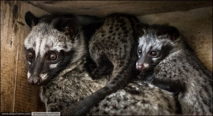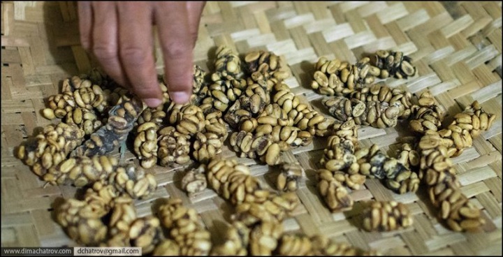 Народная индонезийская игра «Поймай лувака». Считается, что «особый вкус» (tm) получаемому напитку придают ферменты желудочного сока мусанги, в состав которых входит цибетин… Мне вот интересно другое: кто первым догадался заваривать звериные экскременты? Видать, большой просветитель был!..