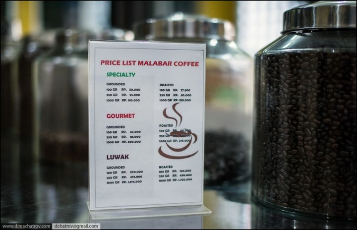 Собственно, теперь о ценнике. Для ориентировки, один американский доллар — это 9500 индонезийских рупий, то есть килограмм фекального эксклюзивного кофе (при покупке на плантации) обойдется вам в 180$. При экспорте ценник удваивается, а иногда и утраивается.