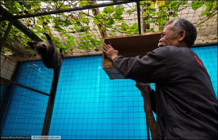 Не думайте, что лувак ест только кофейное зерно. Кофе для него — лакомство. Обычный рацион составляют папайя и бананы в больших количествах, а кофе — только десерт. Взрослый лувак в день может слувачить схомячить не больше полкило ягод. Клетки за спиной работника — жилища луваков, содержащихся на плантации.
