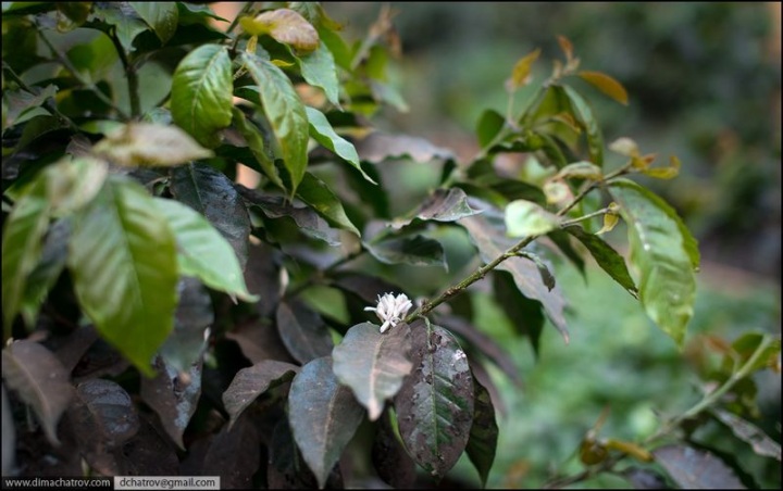 А вот так — одинокое кофейное дерево (ростом с куст). Белые цветочки в скором времени обернутся ягодами с красной шкуркой — так называемыми кофейными вишнями — лакомством для мусанга, небольшого зверька семейства виверровых. Мусанга на местном диалекте называют еще и луваком — этого имени и будем придерживаться.