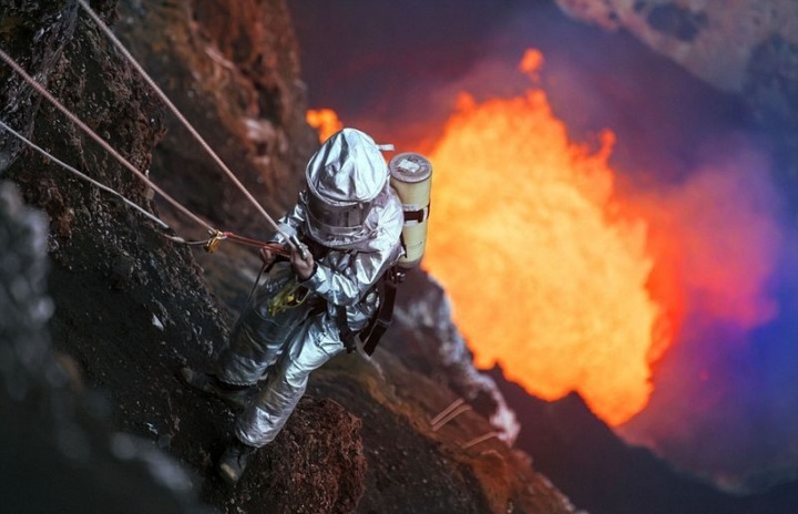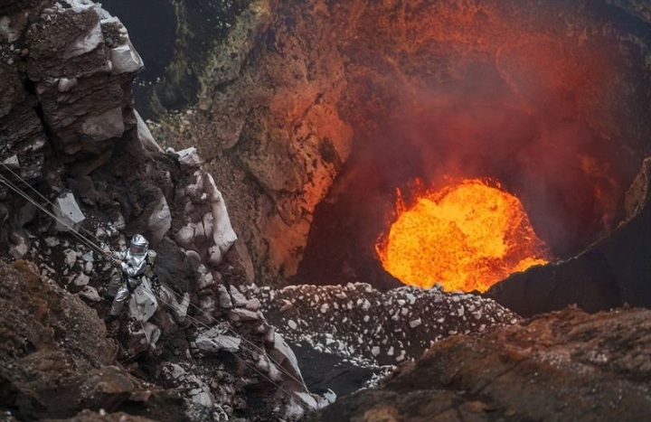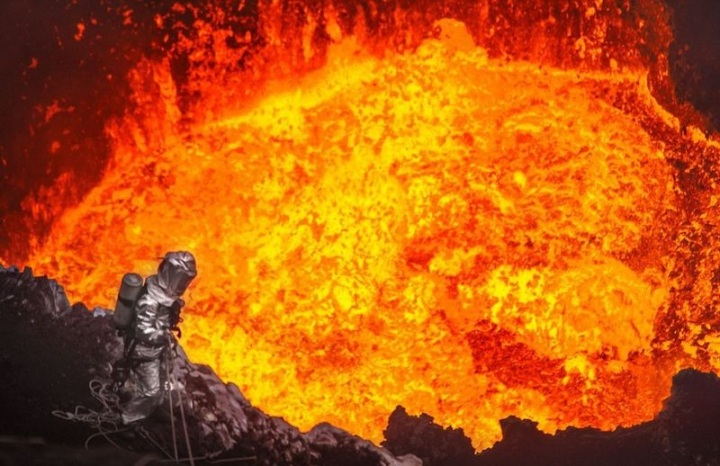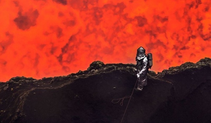 Одевшись в специальный термокостюм он спустился в кратер где температура около 1150 градусов.